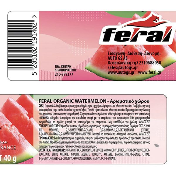 Το οργανικό αποσμητικό χώρου Feral έχει ως βάση οργανικές ίνες, εμποτισμένες με άρωμα, που δίνει στο περιβάλλον σας αναζωογονητικές μυρωδιές της φύσης. Το αρωματικό Watermelon σε συσκευασία κονσέρβας, απευθύνεται σε εκείνους που θέλουν μοναδικά αρώματα και ταυτόχρονα διακριτική τοποθέτηση του αρωματικού. Μπορείτε να τα τοποθετήσετε οπουδήποτε και θα εκπλαγείτε με τη διάρκεια του αρώματος, η οποία είναι μέχρι και 60 ημέρες.