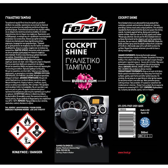 Το γυαλιστικό ταμπλό Feral, είναι ένα προϊόν με μοναδική σύνθεση που γυαλίζει, προστατεύει και συντηρεί τα πλαστικά μέρη του αυτοκινήτου σας χαρίζοντας εκπληκτική λάμψη, και μοναδικό άρωμα. Τα αντιστατικά συστατικά που περιέχει καθώς και οι εξαιρετικής ποιότητας σιλικόνες απωθούν την σκόνη, παρατείνοντας έτσι την λάμψη της επιφάνειας.