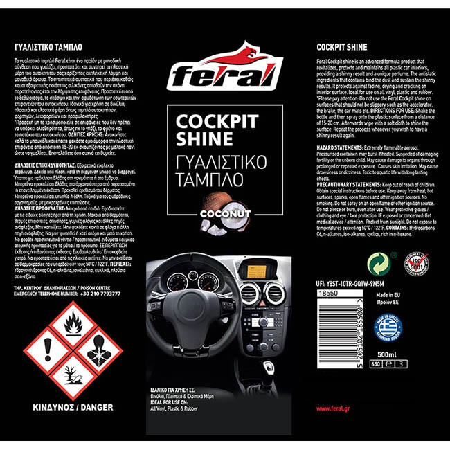 Το γυαλιστικό ταμπλό Feral, είναι ένα προϊόν με μοναδική σύνθεση που γυαλίζει, προστατεύει και συντηρεί τα πλαστικά μέρη του αυτοκινήτου σας χαρίζοντας εκπληκτική λάμψη, και μοναδικό άρωμα. Τα αντιστατικά συστατικά που περιέχει καθώς και οι εξαιρετικής ποιότητας σιλικόνες απωθούν την σκόνη, παρατείνοντας έτσι την λάμψη της επιφάνειας.
