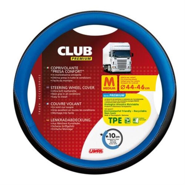 Κάλυμμα τιμονιού CLUB της Lampa από τη σειρά TPE Premium, ιταλικής κατασκευής, σε Medium μέγεθος κι εξωτερική διάμετρο 44-46 cm, κατάλληλο για χρήση σε φορτηγά.